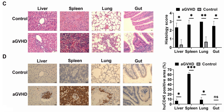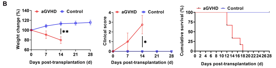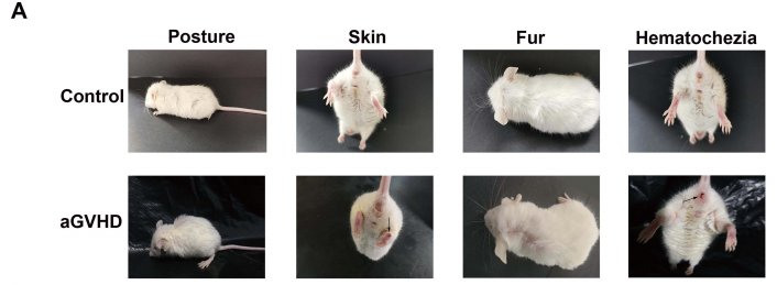 将8-10周龄的NPG小鼠按体重随机分成2组(n=6/group)。Control给予PBS处理,aGVHD组小鼠先辐照后尾静脉注射3×106 PBMCs/小鼠,观察生长状况并评分。aGVHD组出现体重减轻、驼背、皮毛皱褶、活动能力降低和腹泻等症状,且评分显著增加;与人类相似,患有aGVHD的NPG小鼠在肝脏、脾脏、肺和肠道等靶器官表现出严重的炎症、白细胞浸润、坏死和组织损伤,棕色肿块样PBMCs浸润。