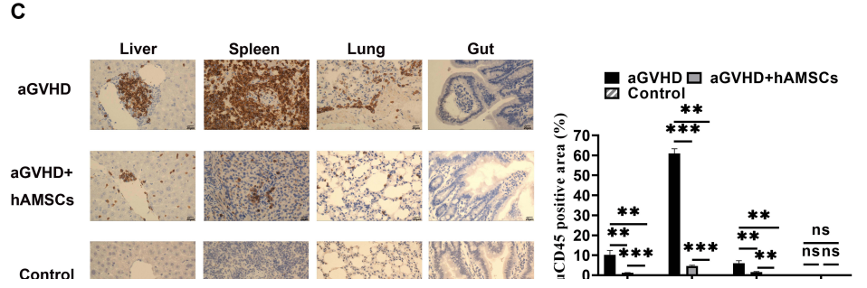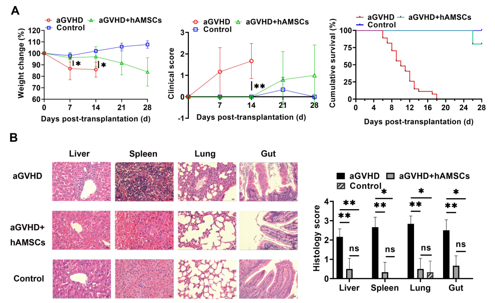 aGVHD组和hAMSCs治疗组的NPG小鼠诱导aGVHD发生,aGVHD组小鼠第3天尾静脉注射PBS,hAMSCs治疗组小鼠尾静脉注射5×105 hAMSCs。对照组小鼠未经治疗。结果表明:hAMSCs在体重减轻和疾病评分方面显著改善了急性GVHD的严重程度,阻止白细胞浸润,减少肝脏、脾脏、肺和肠道的病理变化。