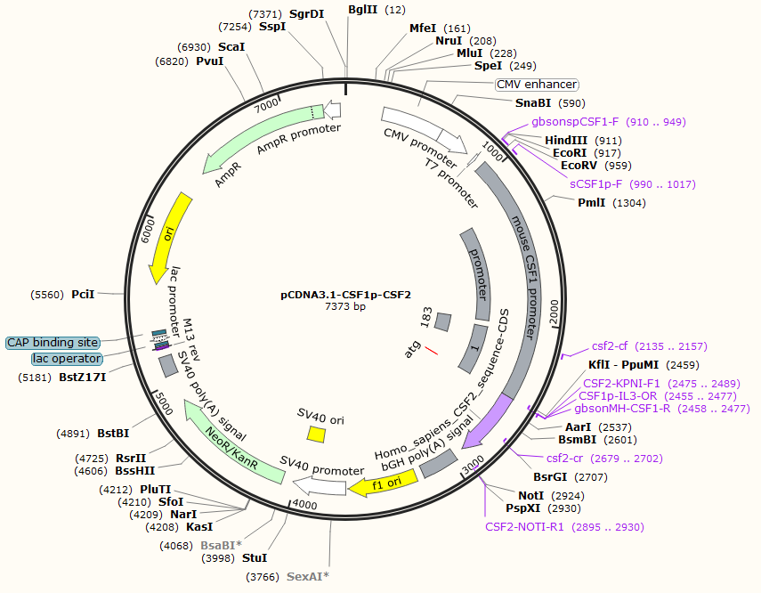CSF2,又称为GM-CSF(粒细胞-巨噬细胞集落刺激因子),是一种造血生长因子,刺激中性粒细胞和巨噬细胞的发育,促进早期红系巨核细胞和嗜酸性祖细胞的增殖和发育。为此,维通达采用转基因的方法,扩增小鼠CSF1的ATG上游1.2Kb的片段(含启动子),与人CSF2的CDS连接,插入pCDNA3.1载体中,构建pCDNA3.1-Csf1p-hCSF2表达载体(如下图所示)。酶切分离表达载体片段,将该片段注射到NPG小鼠的原核中。在获得的后代中筛选到合适表达量的阳性小鼠,在隔离器中,按照近交的方式扩繁,建立商品化的hCSF2 NPG小鼠品系。