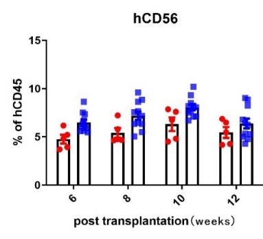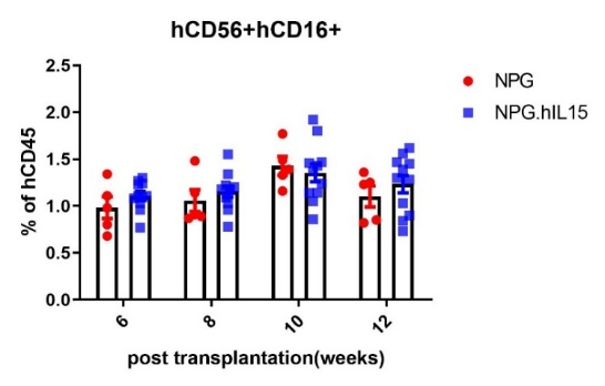 收集hIL15-NPG小鼠外周血并分离血清检测发现,移植HSC后,相较于HSC-NPG而言,HSC-hIL15-NPG的hCD56+ NK重建水平更高,且分化出的hCD16+ NK细胞亚群更高,在观测的12周内,均处于较高水平。