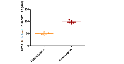 收集hIL15-NPG杂合小鼠与纯合小鼠的外周血并分离血清,通过ELISA检测发现:杂合子血清中hIL15表达量约50 pg/mL,纯合子表达量约为98.8 pg/mL。