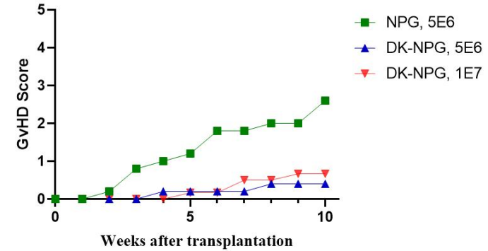 图2. NPG移植人PBMC((5×106)与DKO-NPG小鼠接种Hu-PBMC (5×106与1×107 cells/mouse)后的生存率、体重曲线及GvHD评分