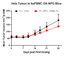 5-6周龄雌性NPG小鼠接种人PBMC,重建一周后皮下接种Hela人宫颈癌细胞,当肿瘤生长到约60-80 mm3时,将小鼠随机分2组(n=6 per group)并进行aPD-1抗体给药,持续监测hCD45+的水平。结果发现aPD-1抗体对DKO-NPG小鼠体内的Hela肿瘤生长有一定的抑制作用。
