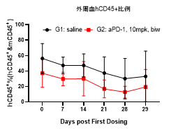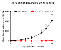 5-6周龄雌性NPG小鼠接种人PBMC,重建一周后皮下接种A-375人恶性黑色素瘤细胞,当肿瘤生长到约100-200 mm3时,将小鼠随机分2组(n=6 per group)并进行aPD-1抗体给药,持续监测hCD45+的水平。结果发现aPD-1抗体可以显著抑制DKO-NPG小鼠体内的A-375肿瘤生长。