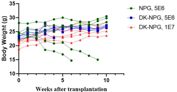 NPG与DKO-NPG移植Hu-PBMC细胞后,与NPG小鼠相比,DKO-NPG小鼠的生存周期更长,体重稳步增长且表现出的 GVHD 症状更轻(体重、活动能力、姿势、毛发和皮肤完整性等)。